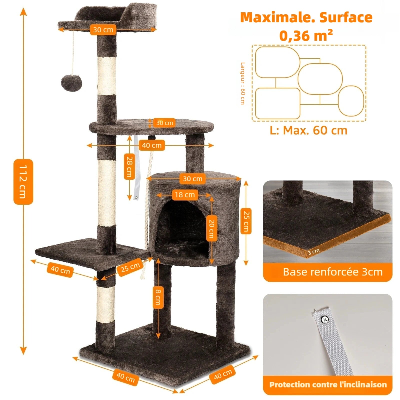 Hauteur Optimale (112 cm) : Idéal pour une utilisation dans n'importe quelle pièce, cet arbre à chat offre une hauteur suffisante pour une vue agréable sans être trop encombrant.